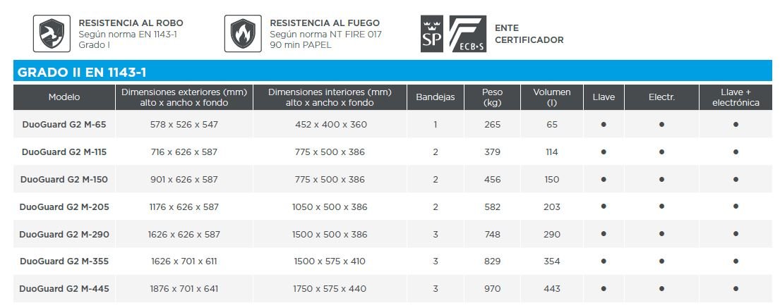 | Duoguard G2 elec M-290 | SOBREPONER | TECLADO ELECTRÓNICO | NO | 90 MINUTOS FUEGO GRADO II ROBO | 1626x626x587 mm 290 Ltr 748 KG | ||