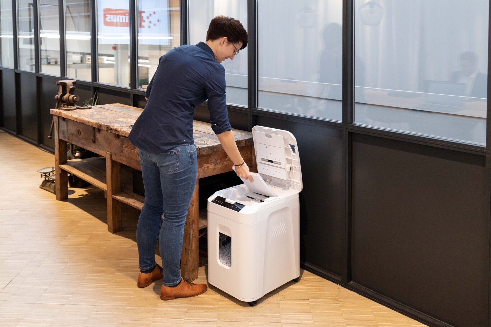 Las destructoras de alimentación automática están revolucionando los métodos de eliminación de documentos. La intimus AutoShred 180 CP4 tritura automáticamente hasta 180 hojas de papel, ahorrando tiempo y esfuerzo en comparación con la alimentación manual. Esta innovación aumenta la productividad y la eficiencia en entornos de oficina ajetreados, permitiendo a los usuarios realizar múltiples tareas mientras los documentos se trituran de forma segura. Incluso después de haber completado sus tareas, la intimus AutoShred sigue siendo fiable, continuando trabajando eficientemente para usted. Su tamaño compacto y su contenedor de residuos de 32 litros la hacen ideal para oficinas o espacios de trabajo habituales, permitiendo una colocación cómoda sin sacrificar el rendimiento. Su funcionamiento es especialmente silencioso con tan solo 58 dB(A). El sistema ECO hace que una vez finalizado el trabajo el equipo se apague después de 5 minutos. Cuenta con ruedas para un fácil desplazamiento.