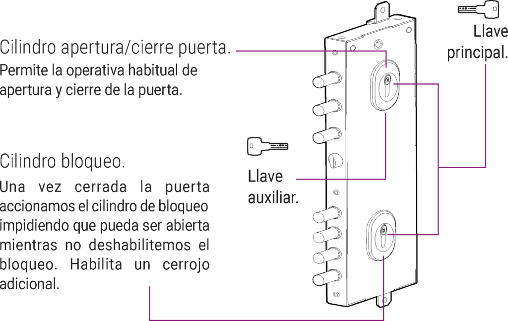 - Una vez cerrada la puerta accionamos el cilindro de bloqueo impidiendo que pueda ser abierta mientras no deshabilitemos el bloqueo. Habilita un cerrojo adicional