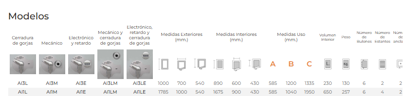 | AI1LM | CERRADURA DE LLAVE + COMBINACIÓN MECÁNICA | NO | 1785x1000x540 mm 650 Ltr 257 KG | ||