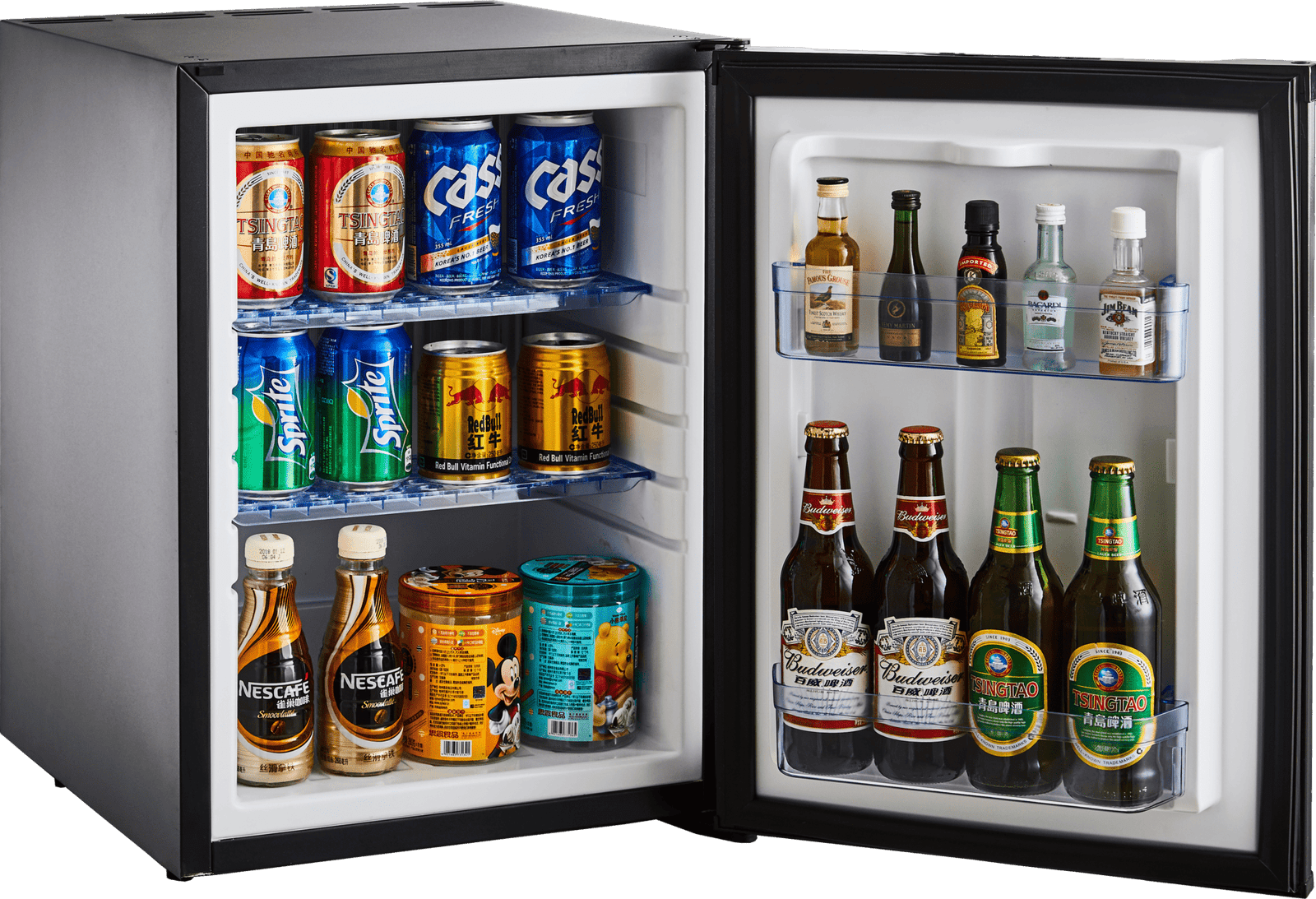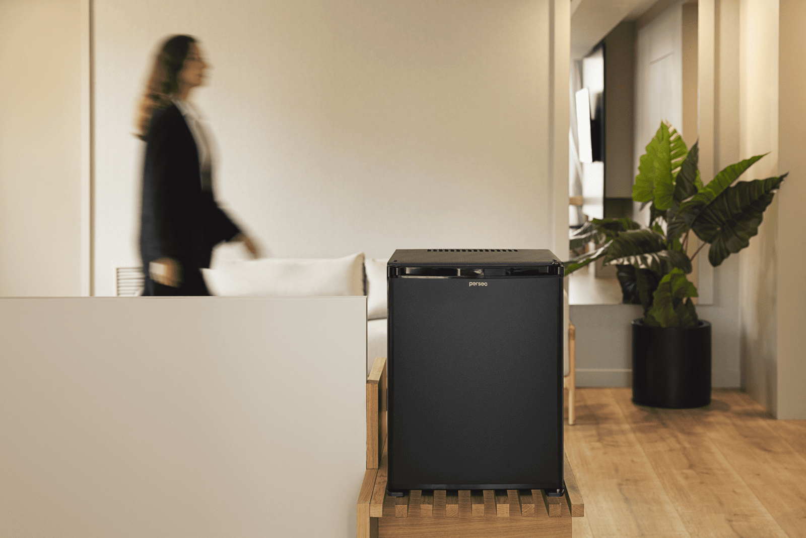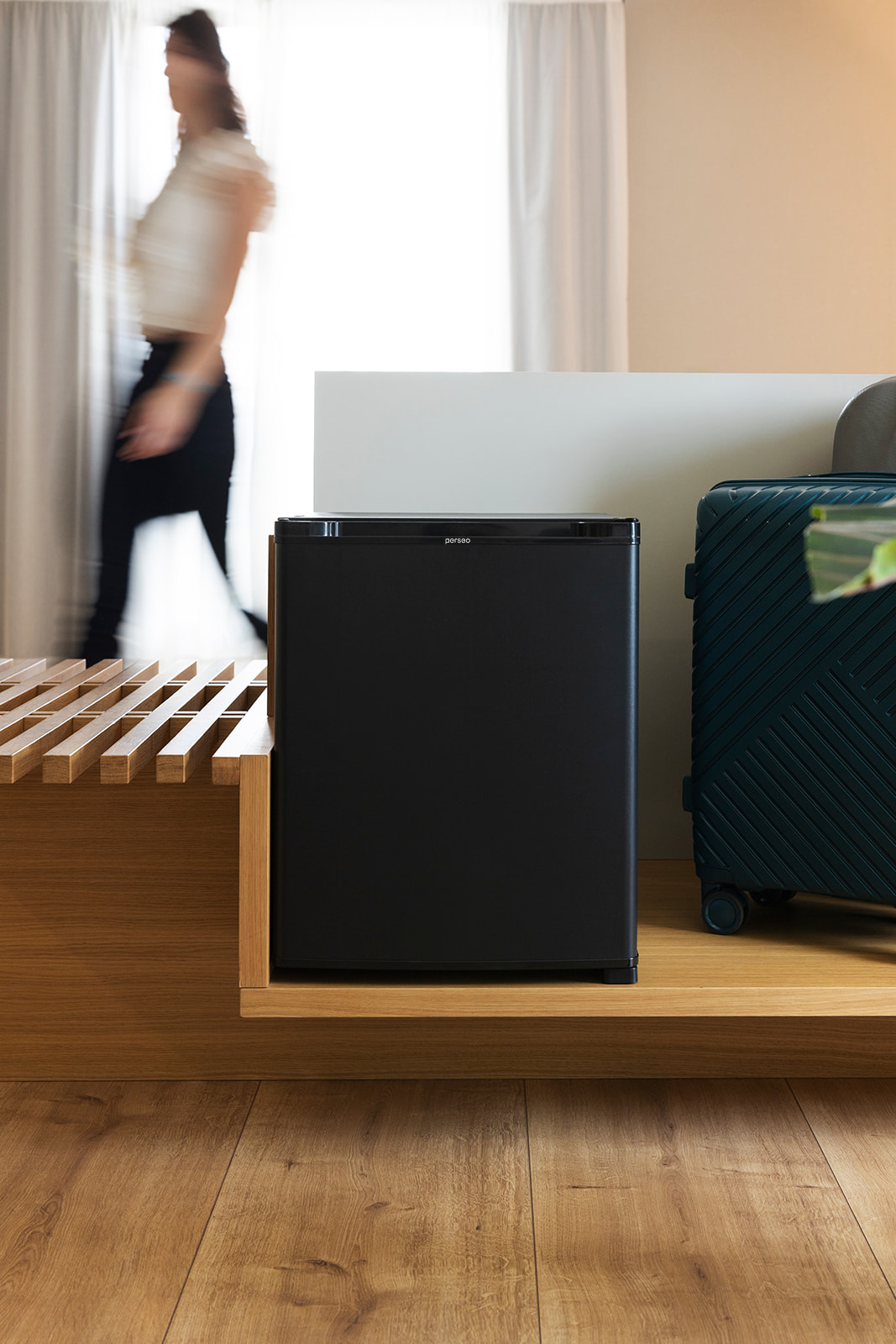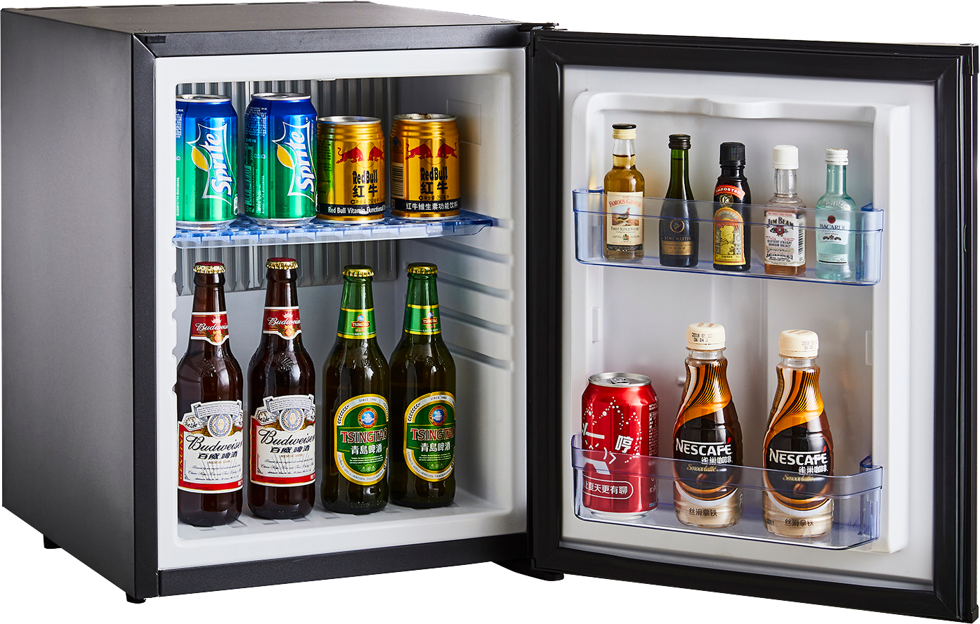 Esta serie de minibares posee un sistema de refrigeración silencioso con diseño funcional y elegante. Es la opción ideal para habitaciones de hotel, ofreciendo comodidad y eficiencia. Tecnología de absorción: Minibar de refrigeración mediante un proceso químico que se realiza en el intercambiador de calor utilizando un refrigerante respetuoso con el medio ambiente y de alta eficiencia. Esta tecnología de refrigeración es completamente silenciosa (0 dB), sin ventiladores ni piezas móviles que generen ruidos o mantenimientos. Cabe destacar que esta tecnología de enfriamiento de minibares permite una mayor velocidad de enfriamiento sin incrementar considerablemente el consumo eléctrico.