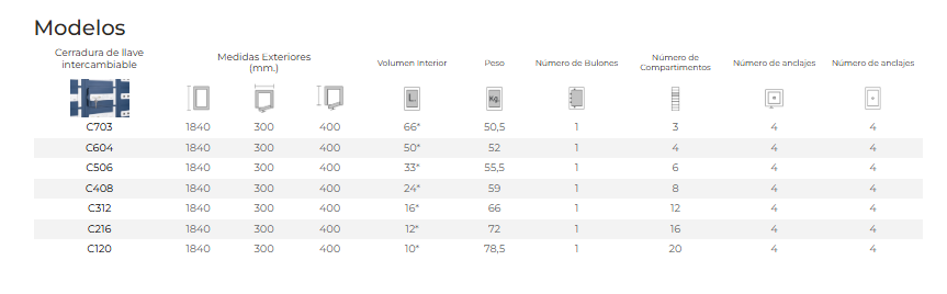 | C703 3 COMPARTIMENTOS | CERRADURA DE LLAVE INTERCAMBIABLE Y CON LLAVE DE CONTROL | NO | 1840x300x400 mm 10 Ltr 78 KG | 1.376,00 € |