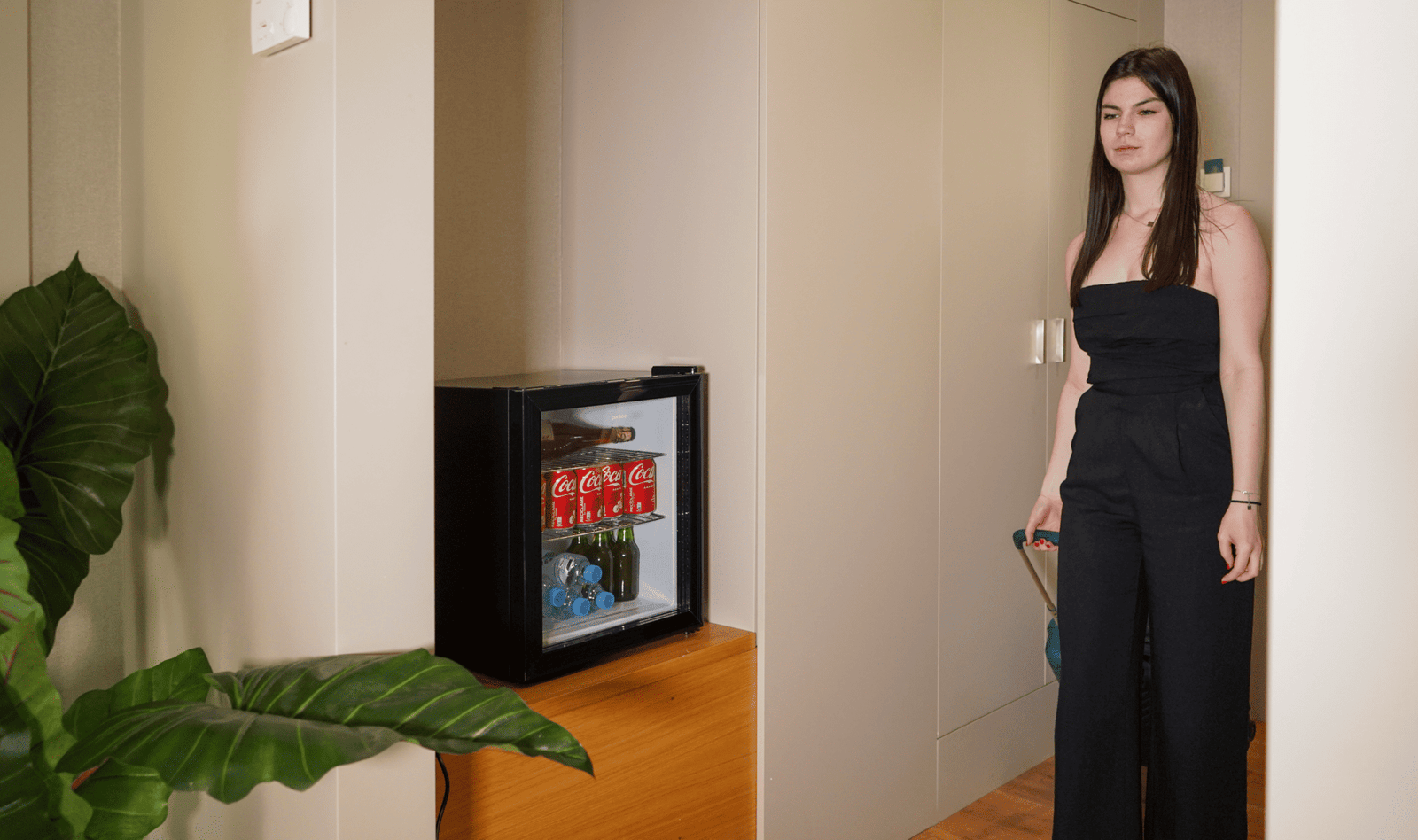 Porque muestra las bebidas y los snacks de una forma tan atractiva, que será imposible resistirse a ellas. Además tiene gran potencia de enfriamiento y es eficiente energéticamente. No dispone de congelador como la serie Glaciar. (39db) Tecnología compresor: El sistema de refrigeración de frigorífico minibar que más enfría en menos tiempo. Indicado para climas muy cálidos y para habitaciones con grandes cambios de temperatura a lo largo del día. Mediante la compresión de fluidos refrigerantes en un circuito cerrado se consigue enfriar el interior del minibar y disipar el calor al exterior. En los minibares Perseo que funcionan con esta tecnología de minibares, destaca su gran potencia de enfriamiento y su respeto por el medio ambiente, ya que no contienen CFC.