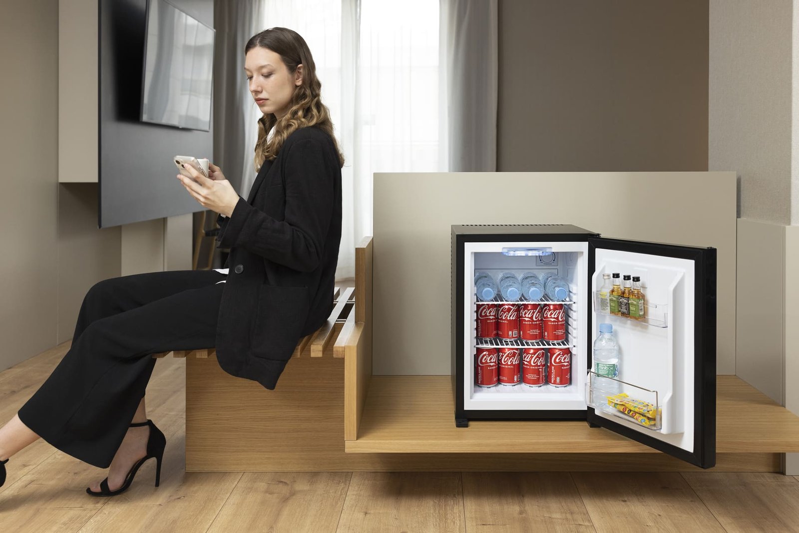 Frigorífico Minibar de refrigeración mediante un intercambiador de calor eléctrico completamente silencioso (0 dB) sin ventiladores ni piezas móviles que generen ruidos o mantenimientos. El sistema inteligente de control de temperatura del minibar se encarga de consumir sólo la potencia necesaria para mantener la temperatura interior deseada de la nevera minibar, lo cual se traduce en un significante ahorro energético para el hotel respecto a otras tecnologías similares del mercado.