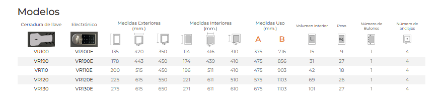 | VR100 | CERRADURA DE LLAVE | 135x420x350 mm 15 Ltr 9 KG | ||