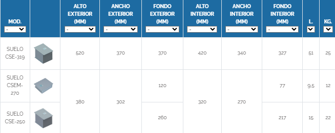 | SUELO CSE-250 | SOBREPONER | CERRADURA DE LLAVE + TECLADO ELECTRÓNICO | NO | NO | 380x302x260 mm 15 Ltr 22 KG |