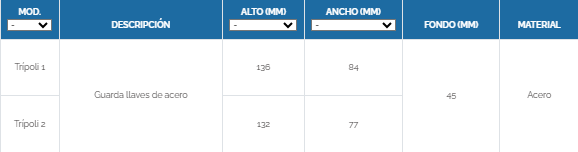 – Trípoli 1: fácil instalación en puertas, muros o paredes mediante la tornillería incluida. Dispone de imán interior para sujeción de llaves.